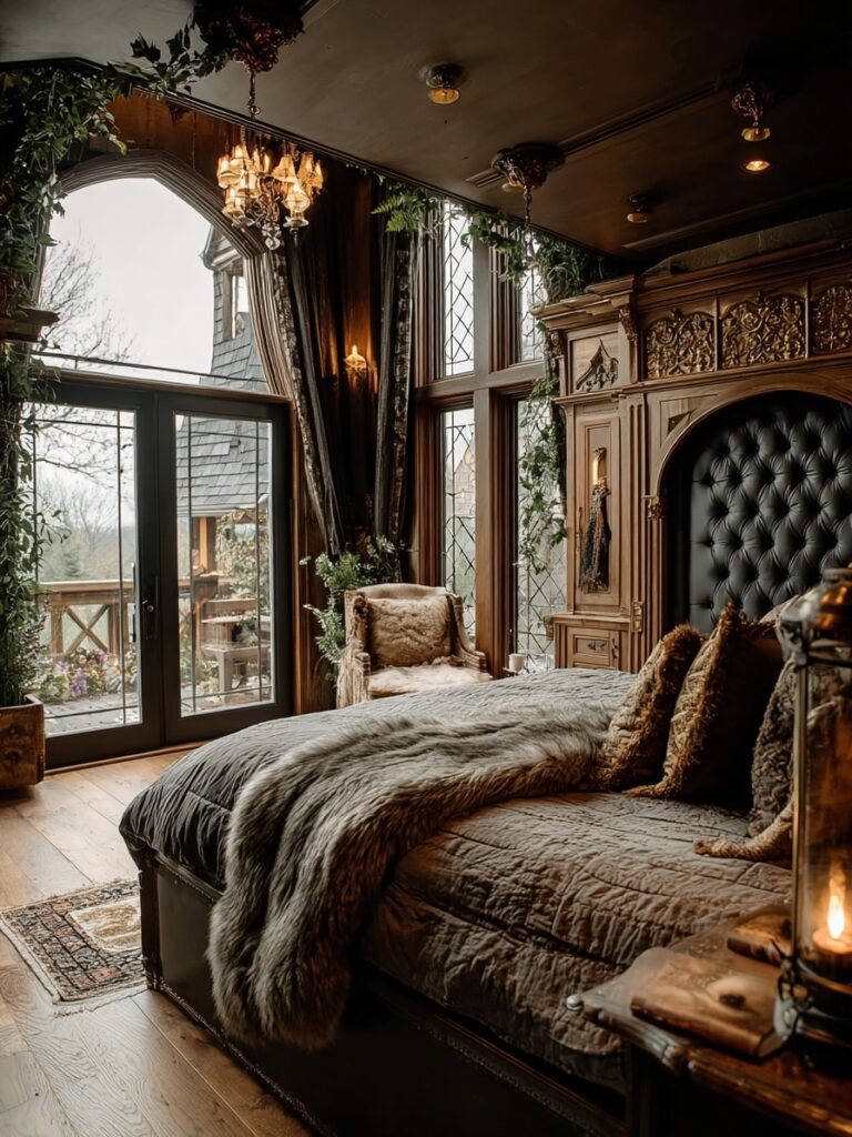 This bedroom feels like a romantic sanctuary, combining carved wood details, plush fabrics, and gentle lighting. Large windows and trailing greenery connect the interior to the outdoors, while the layered textures make the space feel both grand and deeply personal.