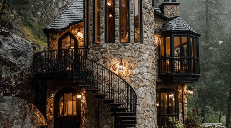 The exterior captures a fairytale-like stone tower home nestled into a misty landscape. Curved staircases, arched windows, and glowing interior lights give the structure a storybook presence, blending seamlessly with the surrounding nature and evoking timeless romance and escape.