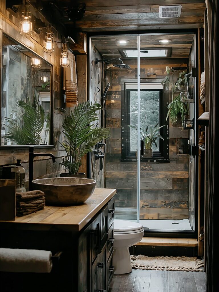 This bathroom blends rustic charm with modern comfort, using warm wood textures, soft lighting, and natural elements like plants to create a calm, spa-like atmosphere. The glass shower and minimalist fixtures keep the space feeling open while maintaining a cozy, cabin-inspired character.