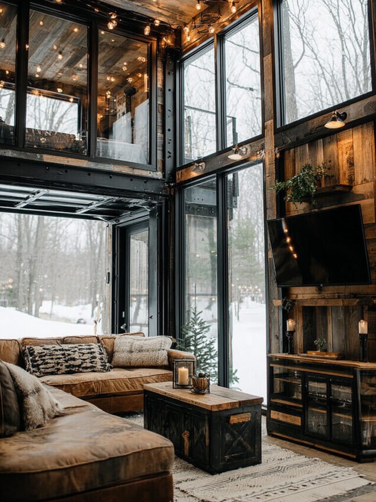 The living area feels airy and welcoming, with expansive windows, high ceilings, and a thoughtful mix of rustic materials and modern design. Warm lights, comfortable seating, and simple decor create a space that encourages both relaxation and connection with the surrounding nature.