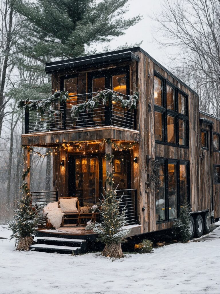 The exterior showcases a compact yet striking modern cabin, where clean lines meet natural wood finishes. Surrounded by snow and trees, the home feels both contemporary and deeply connected to its environment, offering a cozy refuge that blends seamlessly into the landscape.