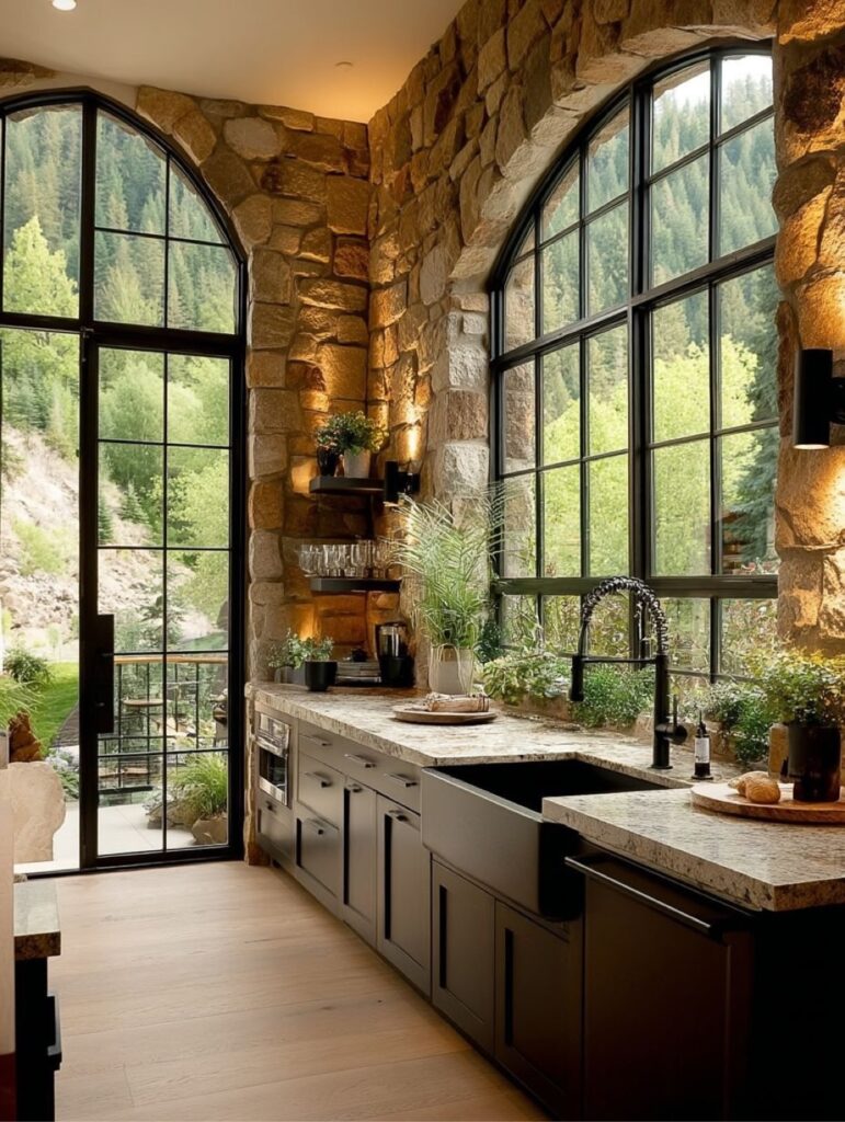 In the kitchen, rustic stone meets modern craftsmanship through dark cabinetry, stone countertops, and industrial-style fixtures. Large windows frame lush outdoor views, making the space feel fresh, functional, and seamlessly connected to its surroundings.