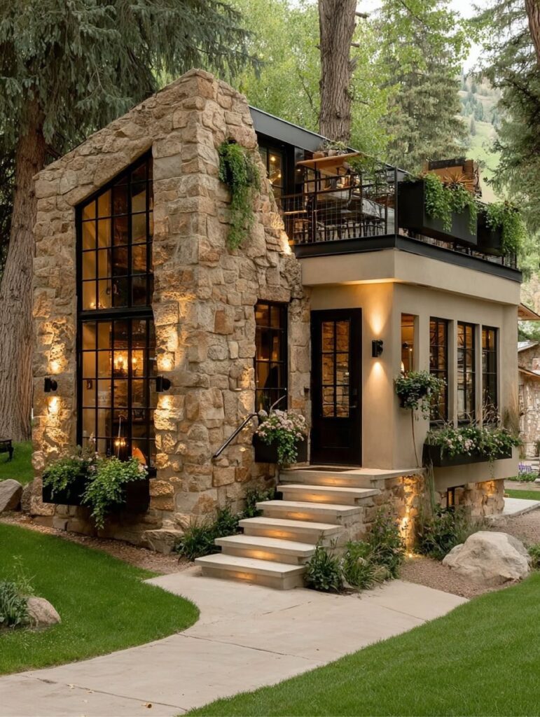 The exterior showcases a harmonious blend of stone, glass, and greenery, giving the home a timeless yet contemporary character. Thoughtful lighting, clean lines, and natural materials allow the house to sit gracefully within its landscape, reflecting warmth, balance, and refined design.