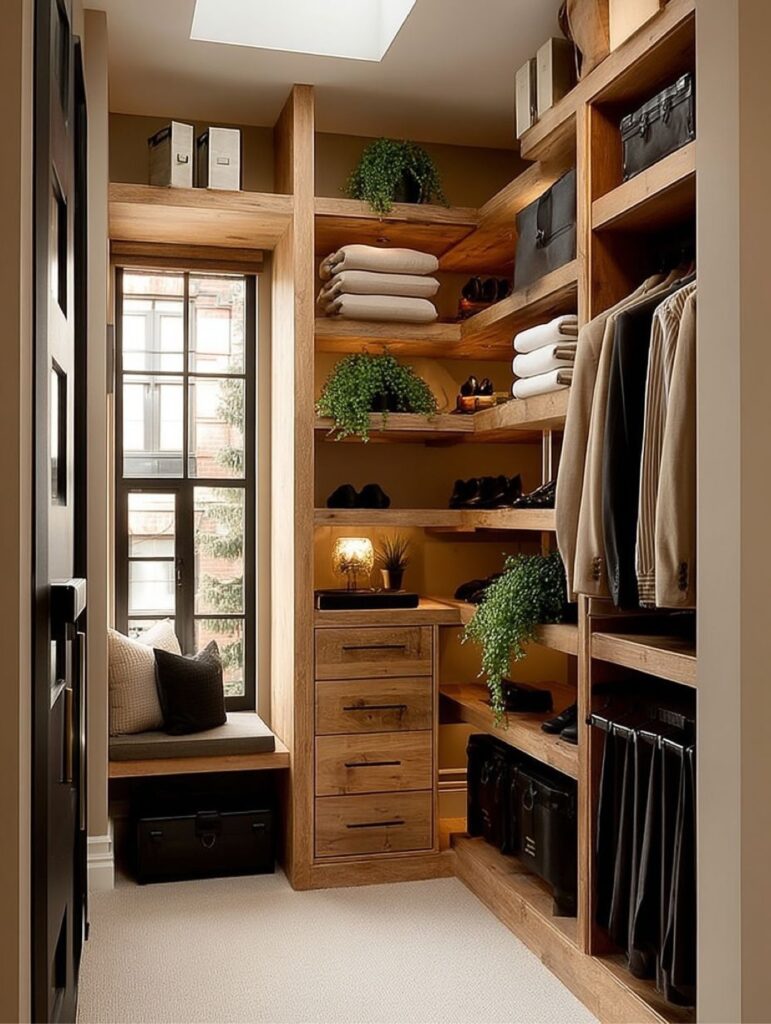 The walk-in closet is thoughtfully designed with warm wood shelving, soft lighting, and clean lines that balance function and elegance. Open storage, integrated drawers, and touches of greenery make the space feel organized, inviting, and effortlessly luxurious.