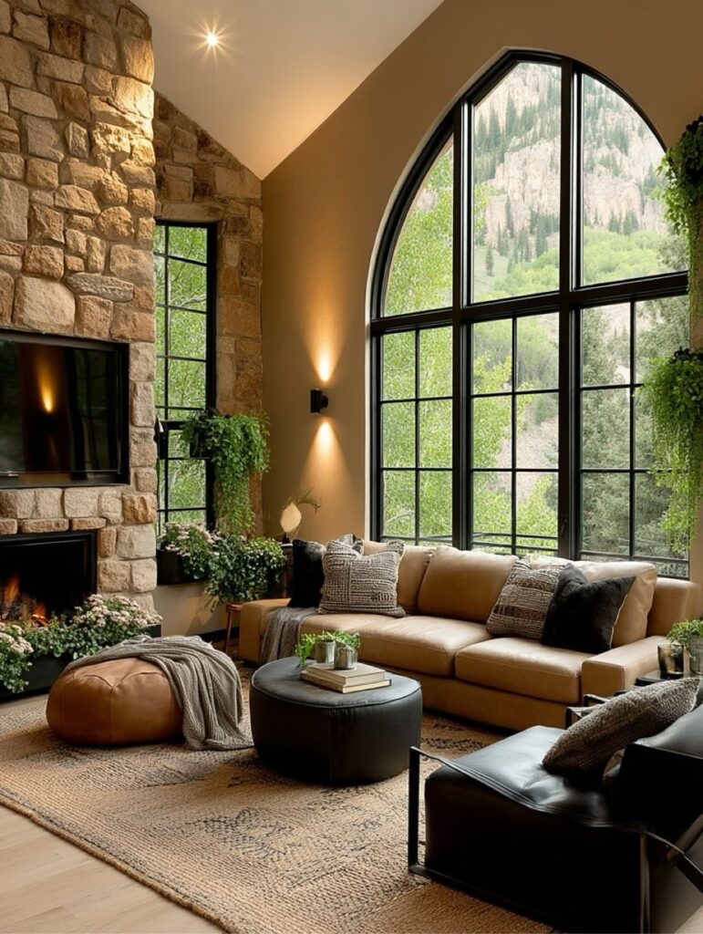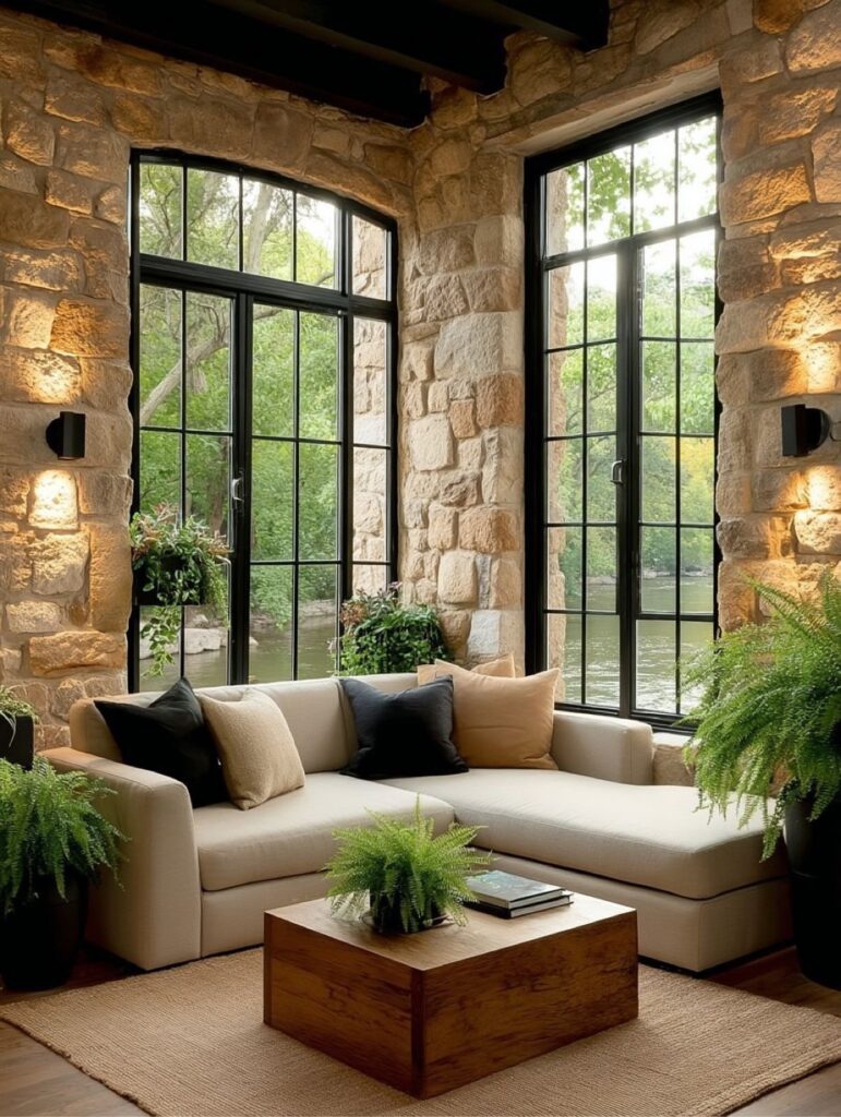 This seating nook embraces comfort and simplicity, with plush sofas, natural fabrics, and warm wood tones. The stone walls and tall windows enhance the sense of calm, offering a cozy place to relax while staying visually connected to nature outside.