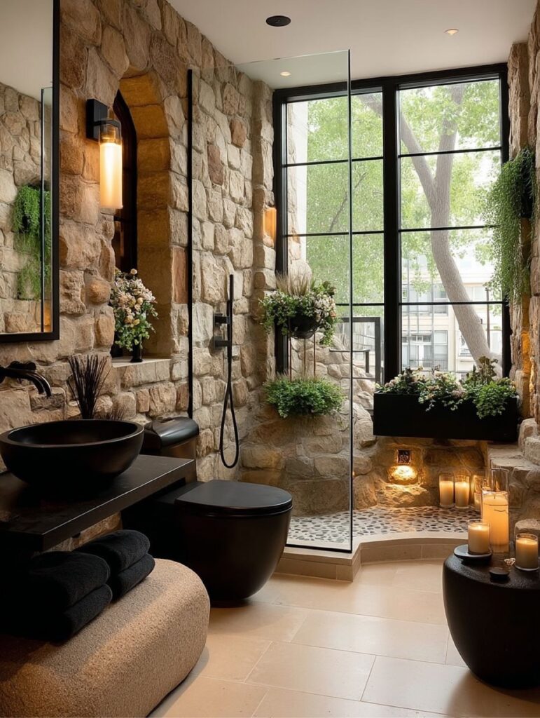 This bathroom blends raw stone walls with sleek modern fixtures to create a spa-like retreat. Natural textures, warm lighting, and greenery soften the space, while the glass shower and matte black accents add a contemporary contrast that feels both calming and refined.