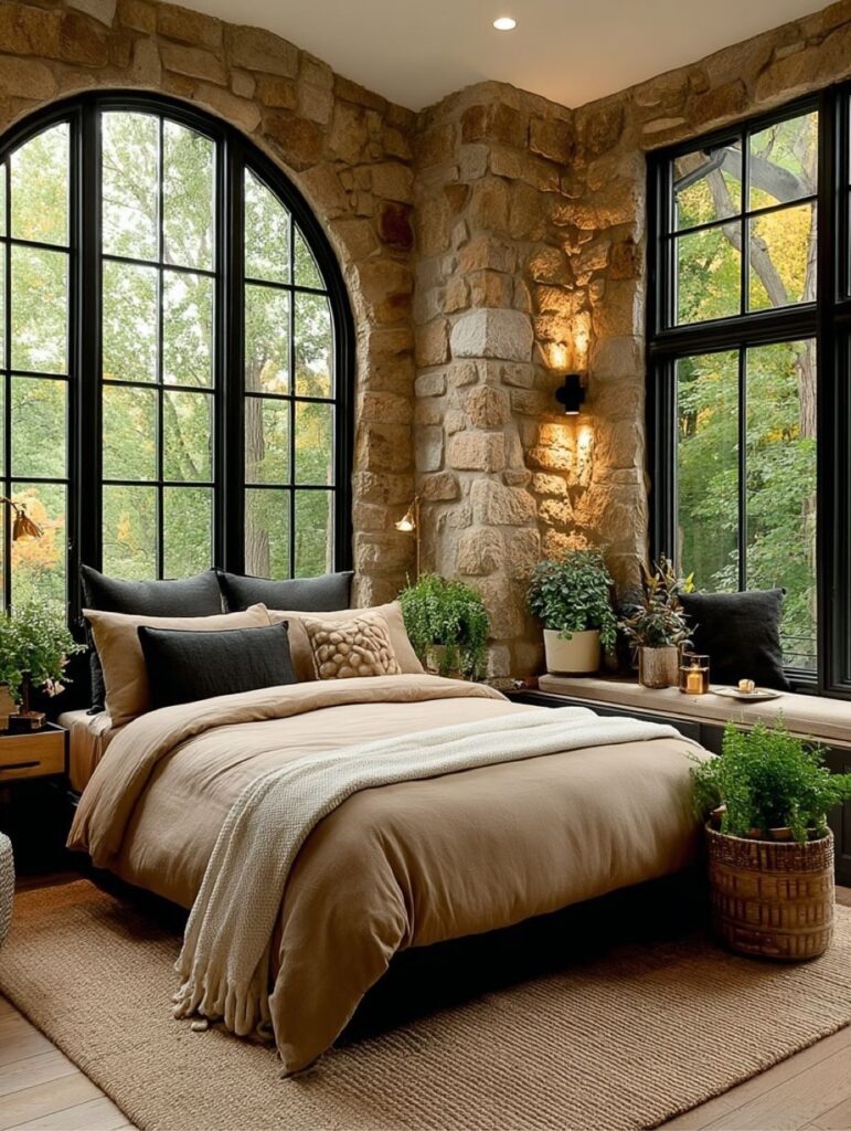 This bedroom offers a serene escape, framed by stone walls and large arched windows that welcome nature indoors. Neutral textiles, layered cushions, and natural light create a peaceful atmosphere that feels grounded, cozy, and deeply restorative.