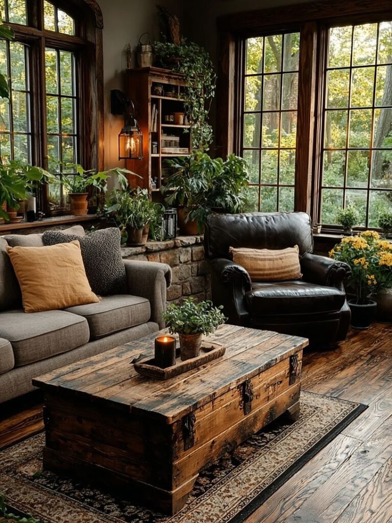 The living room is warm, intimate, and full of character, with rich wood tones, soft textiles, and large windows that bring the outdoors in. Carefully placed plants and rustic furnishings create a cozy retreat that feels timeless and deeply connected to nature.