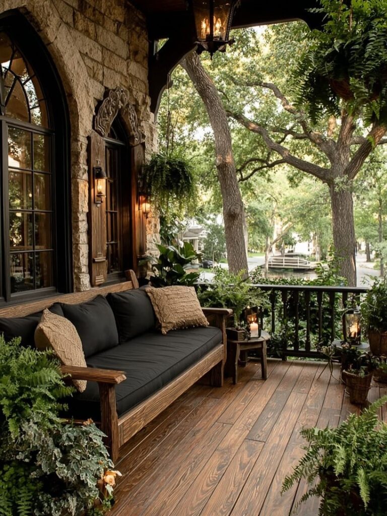 The inviting front porch sets the tone with warm wood floors, soft lighting, and lush greenery. Surrounded by mature trees, this space feels like a peaceful outdoor living room—perfect for slow mornings, quiet evenings, and enjoying nature right at the doorstep.