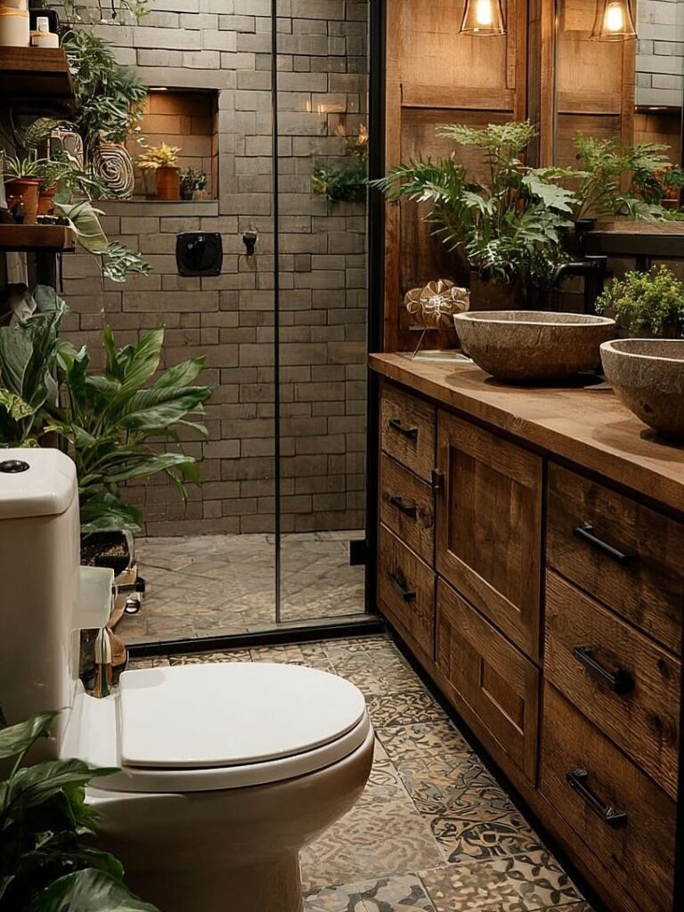 The bathroom blends rustic charm with modern comfort, featuring natural wood cabinetry, stone textures, and abundant plants. The thoughtful layout and earthy materials create a spa-like atmosphere that feels both grounding and luxurious despite the compact size.