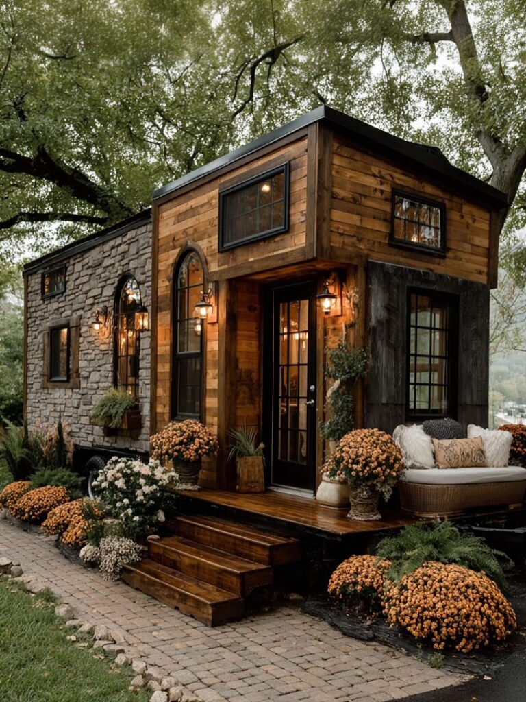 The exterior of the tiny home showcases a stunning blend of stone, wood, and thoughtful landscaping. With its charming architectural details and inviting entrance, the home feels both grounded and magical—a perfect balance of craftsmanship, comfort, and natural beauty.