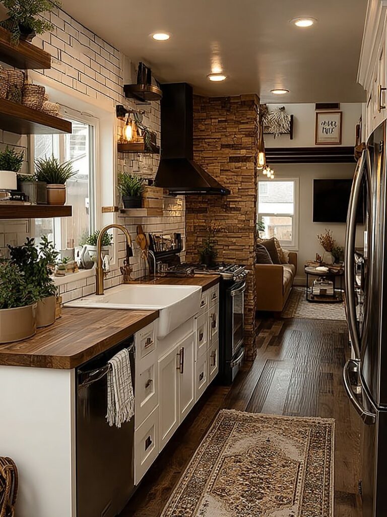 The kitchen is a beautifully functional heart of the home, combining farmhouse elements with smart design. Open shelving, warm wood countertops, and cozy lighting make the space feel welcoming, while the seamless flow into the living area enhances openness and practicality.
