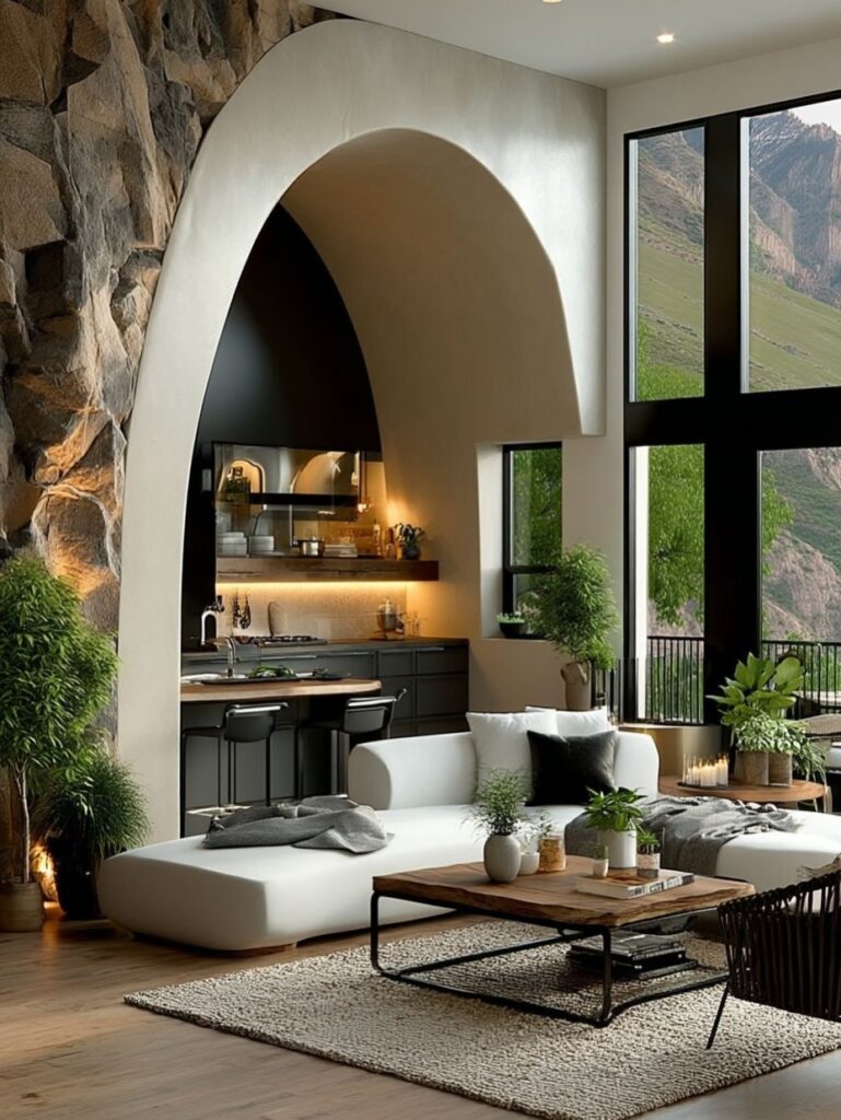 An arched architectural opening becomes the focal point of this open-plan living area, seamlessly connecting the lounge and kitchen. Natural stone, warm wood tones, and modern furnishings create a balanced space that feels both dramatic and welcoming, perfect for everyday living or entertaining.