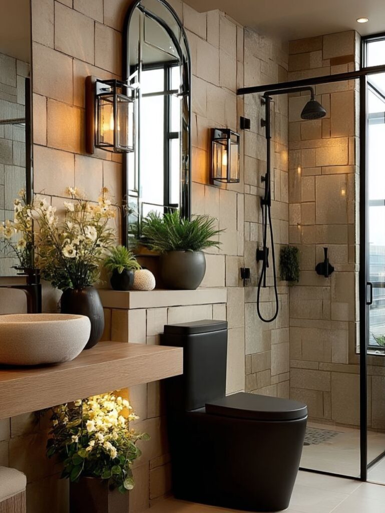 The bathroom exudes understated luxury with textured stone walls, a glass-enclosed shower, and matte black fixtures. Soft lighting, natural greenery, and a sculptural vanity create a serene, spa-like atmosphere that feels both modern and grounded in natural materials.