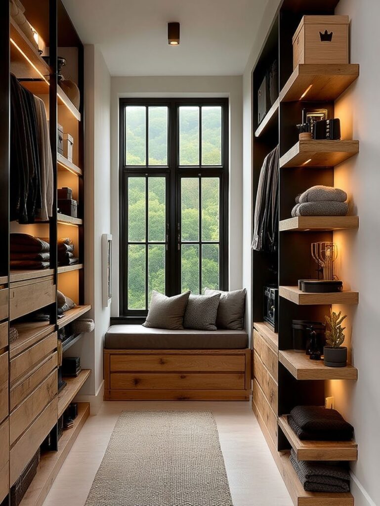 This thoughtfully designed walk-in closet blends function and calm aesthetics, featuring warm wood shelving, integrated lighting, and tailored storage on both sides. A built-in window bench anchors the space, inviting natural light and offering a quiet moment to pause while keeping the layout organized, elegant, and highly efficient.