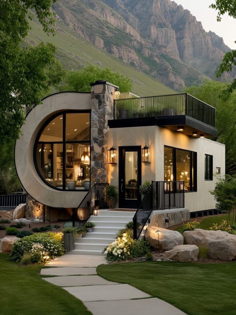 At dusk, the home reveals its sculptural character, highlighted by warm exterior lighting and bold geometric forms. The combination of smooth plaster, stone accents, and expansive glass creates a striking yet harmonious presence within the mountainous landscape.