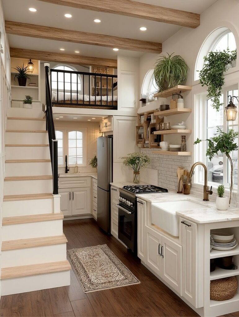 This compact kitchen is the heart of the home, combining smart layout with farmhouse elegance. Open shelves, a deep apron sink, and soft neutral tones keep the space bright and functional, while the staircase leads seamlessly to the loft, adding architectural interest.