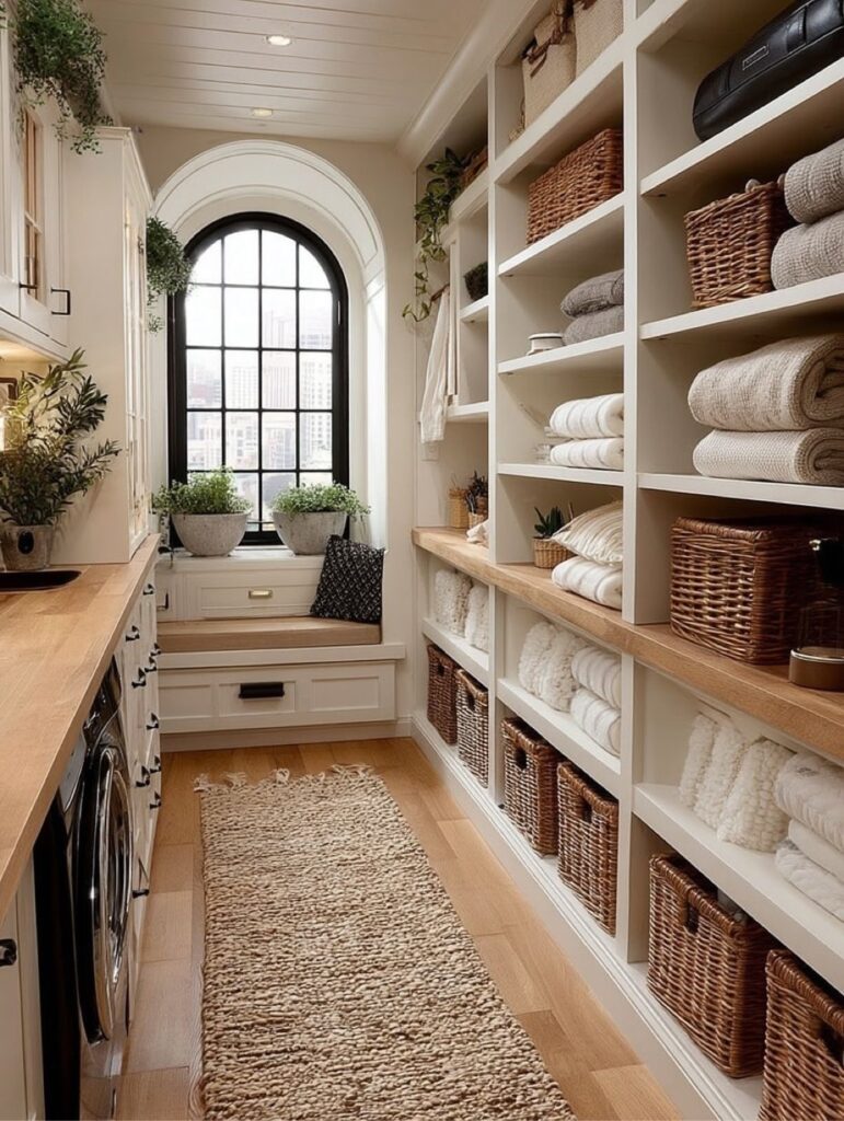 Designed for both beauty and efficiency, this laundry area feels more like a boutique closet than a utility space. Open shelving, woven baskets, and warm wood accents keep everything organized while adding texture and charm, proving that small spaces can still feel refined and inviting.