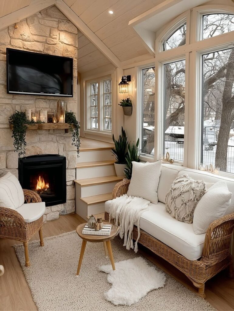 The living space feels intimate yet open, anchored by a stone-accent fireplace that adds warmth and character. Large windows bring the outdoors in, while soft furnishings and natural textures create a relaxing spot perfect for unwinding or entertaining.