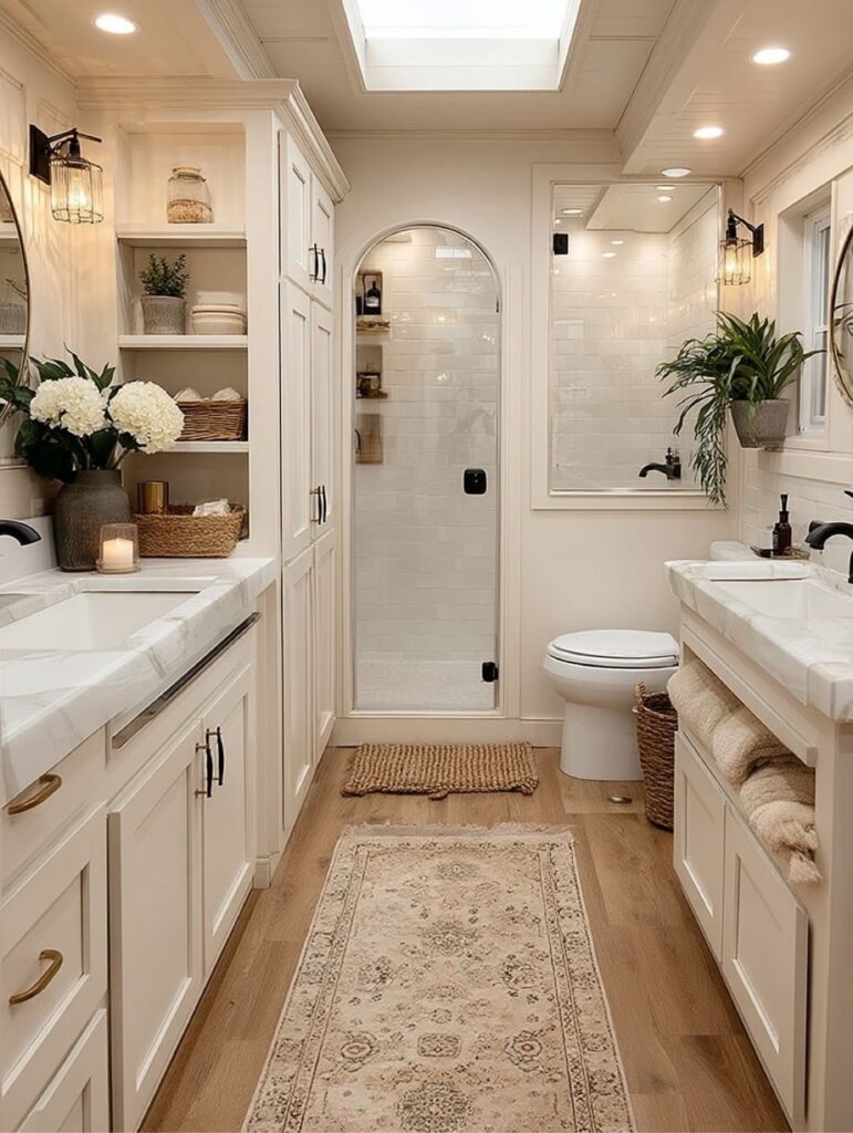This serene bathroom blends classic farmhouse style with modern comfort. Soft white cabinetry, marble-look countertops, and warm wood flooring create a calm, spa-like atmosphere, while the arched glass shower and skylight fill the space with natural light and elegant character.