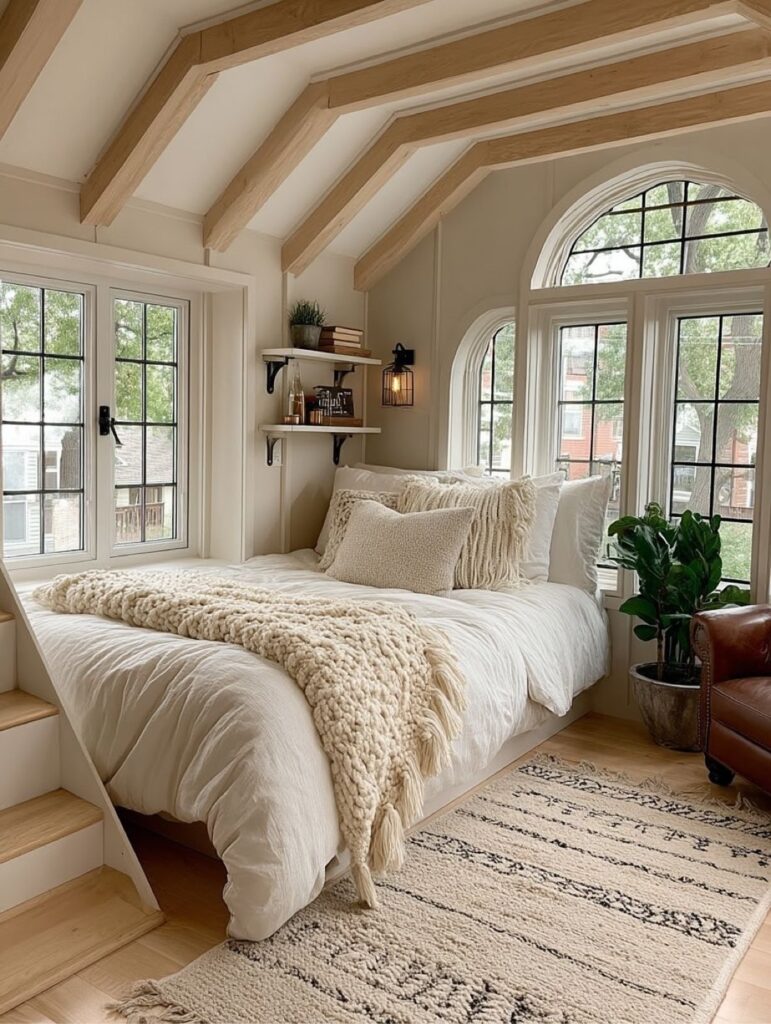 The bedroom is a peaceful retreat filled with light and warmth. Exposed ceiling beams, arched windows, and layered textiles create a cozy, cottage-inspired feel, while the elevated bed platform maximizes space without sacrificing comfort or style.
