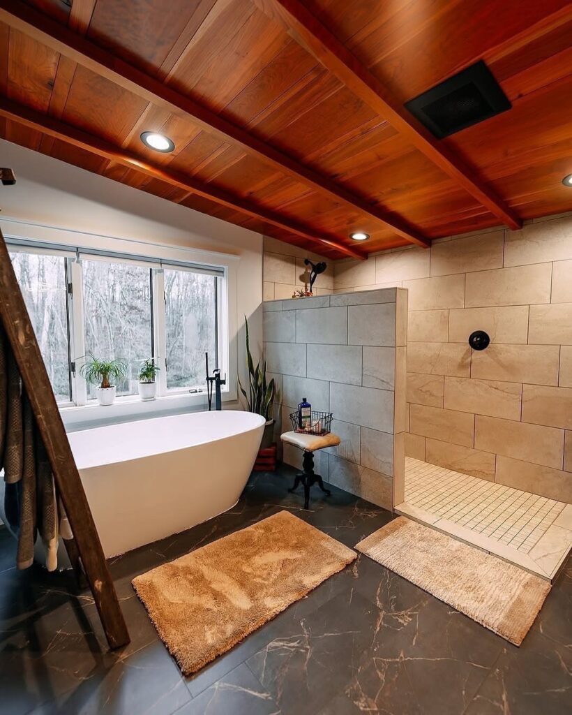 This bathroom feels more like a private spa than a typical home bath. A freestanding soaking tub sits beneath a wide window, bringing in natural light and forest views, while the walk-in tiled shower adds a clean, modern contrast. The rich wood ceiling with exposed beams warms the space, balancing the stone tile and dark flooring for a calm, grounded atmosphere designed for relaxation.