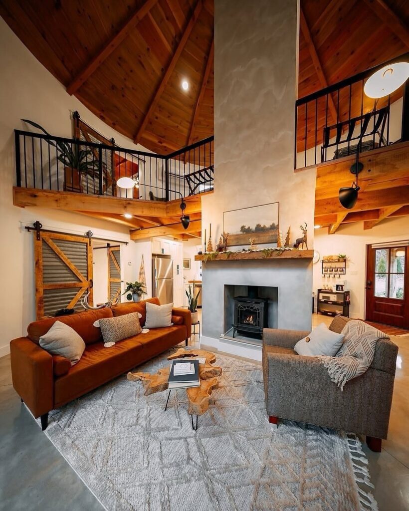 This living area is the heart of the home, featuring a double-height ceiling, exposed timber structure, and a striking central fireplace. The open loft above adds depth and visual interest, while warm furniture tones and layered lighting make the space feel intimate despite its scale. It’s a room designed equally for gathering and unwinding.