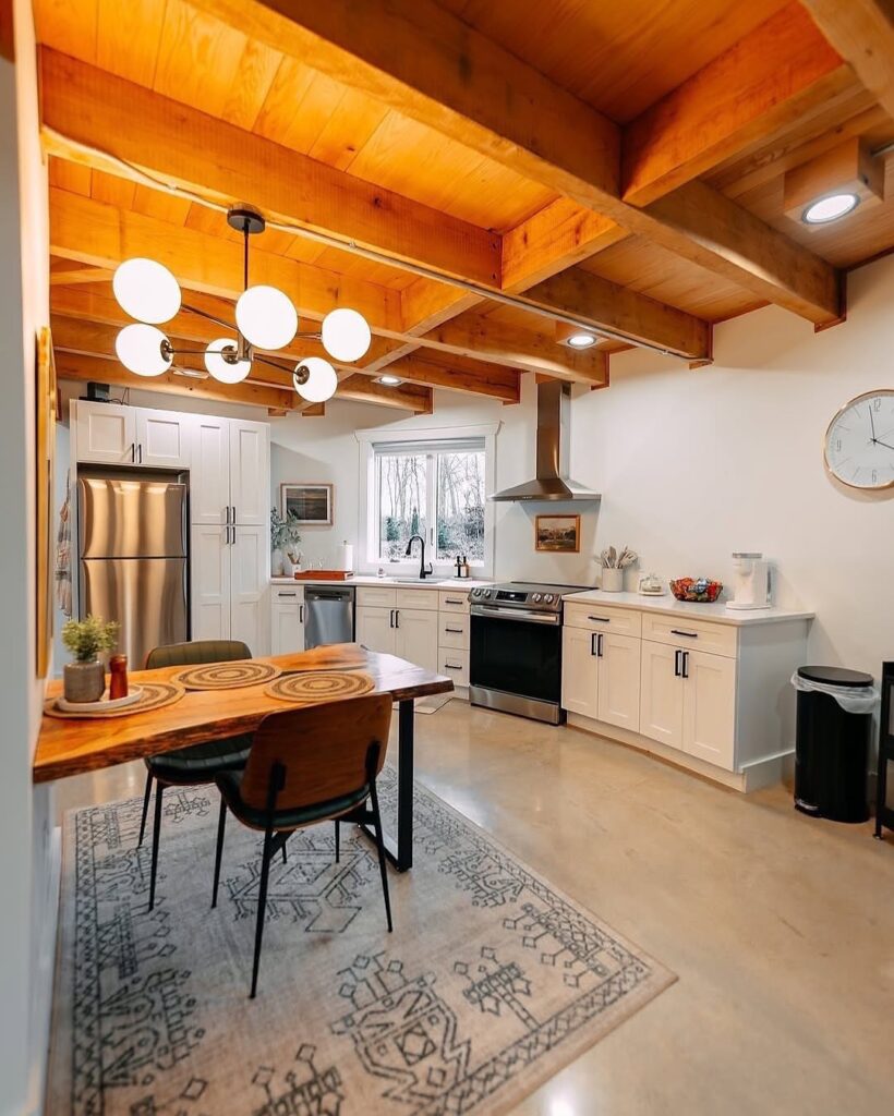 The kitchen combines clean white cabinetry with exposed wood beams overhead, striking a perfect balance between modern and rustic. Stainless steel appliances, ample counter space, and a simple dining table make the space both practical and welcoming. Natural light from the window keeps the room bright and connected to the outdoors.