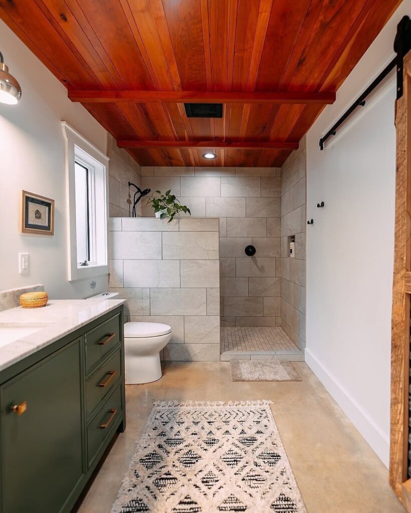 Here, functionality meets refined simplicity. The walk-in shower with large-format stone tiles creates a seamless, open feel, while the wood-paneled ceiling continues the home’s rustic theme. A muted green vanity adds character and color without overpowering the space, proving that even compact bathrooms can feel elegant and intentional.