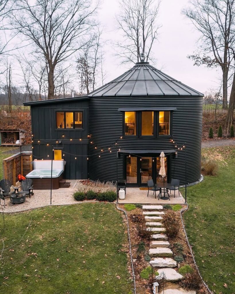 From the outside, the home stands out with its bold, dark exterior and distinctive rounded form. Soft lighting and string lights create a welcoming glow at dusk, while large windows reveal the warmth inside. The design blends modern architecture with a cozy, cabin-like presence that feels both unique and grounded.
