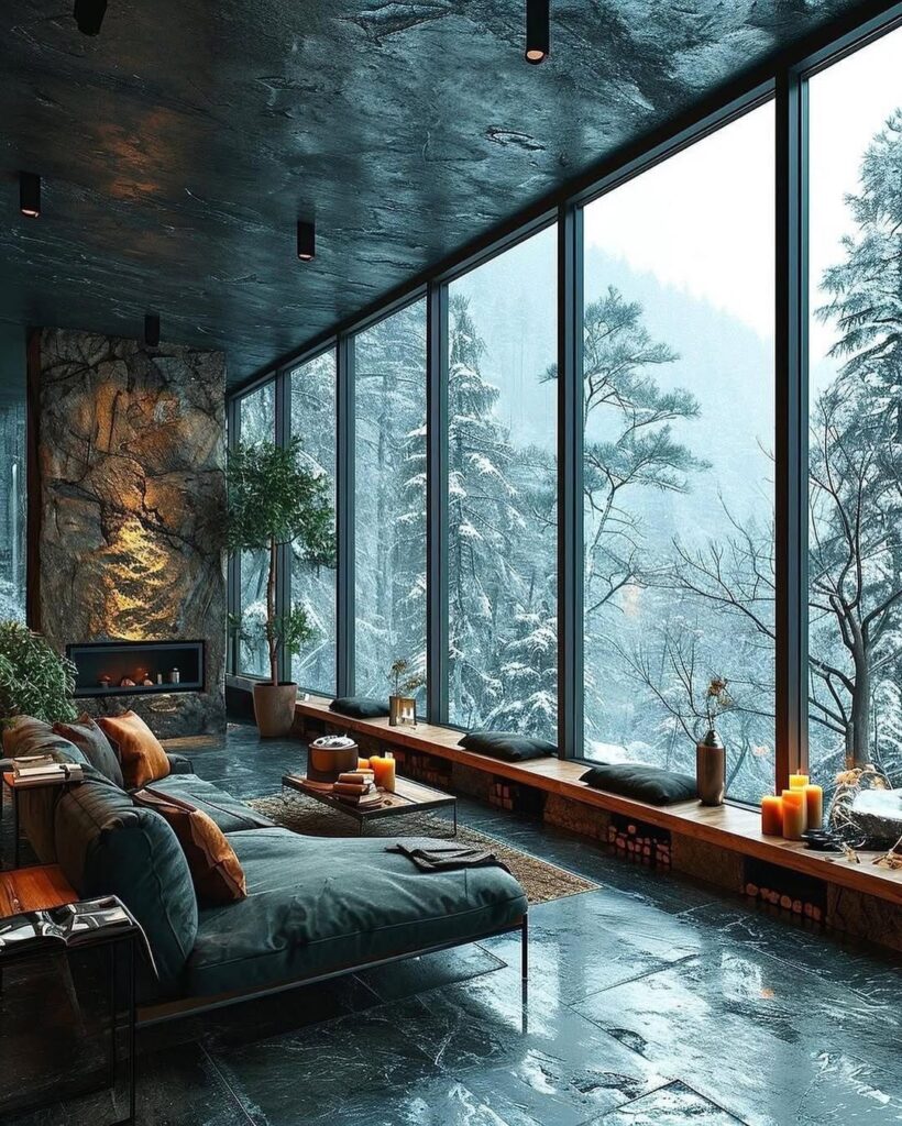 In this lounge perspective, the architecture emphasizes horizontality and calm. A continuous window bench lines the glass façade, offering a place to sit, read, or simply watch snowfall drift through the trees. The subdued color palette—deep greens, charcoal tones, and natural wood—enhances the feeling of warmth without competing with the view.