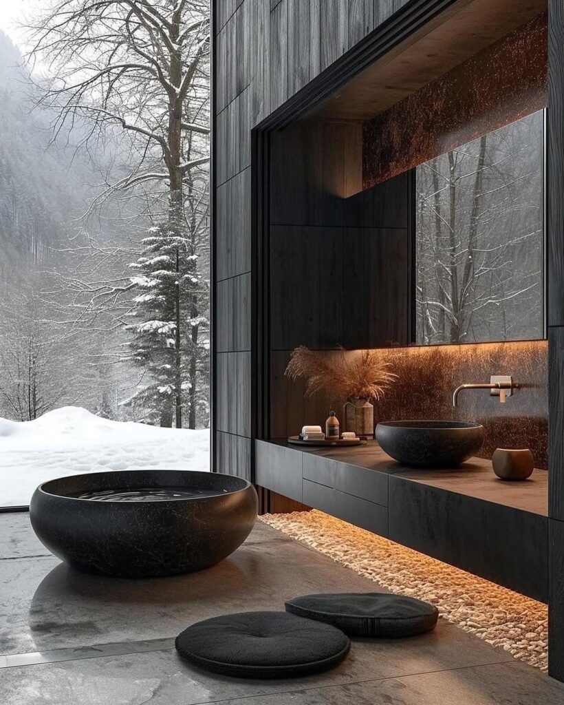 The bathroom becomes a tranquil ritual space, blending Japanese-inspired minimalism with alpine luxury. A sculptural stone soaking tub sits beside a full-height window, allowing snow-covered trees to become living artwork. Natural textures—charcoal stone, warm wood, and soft textiles—create a calming balance between raw and refined.