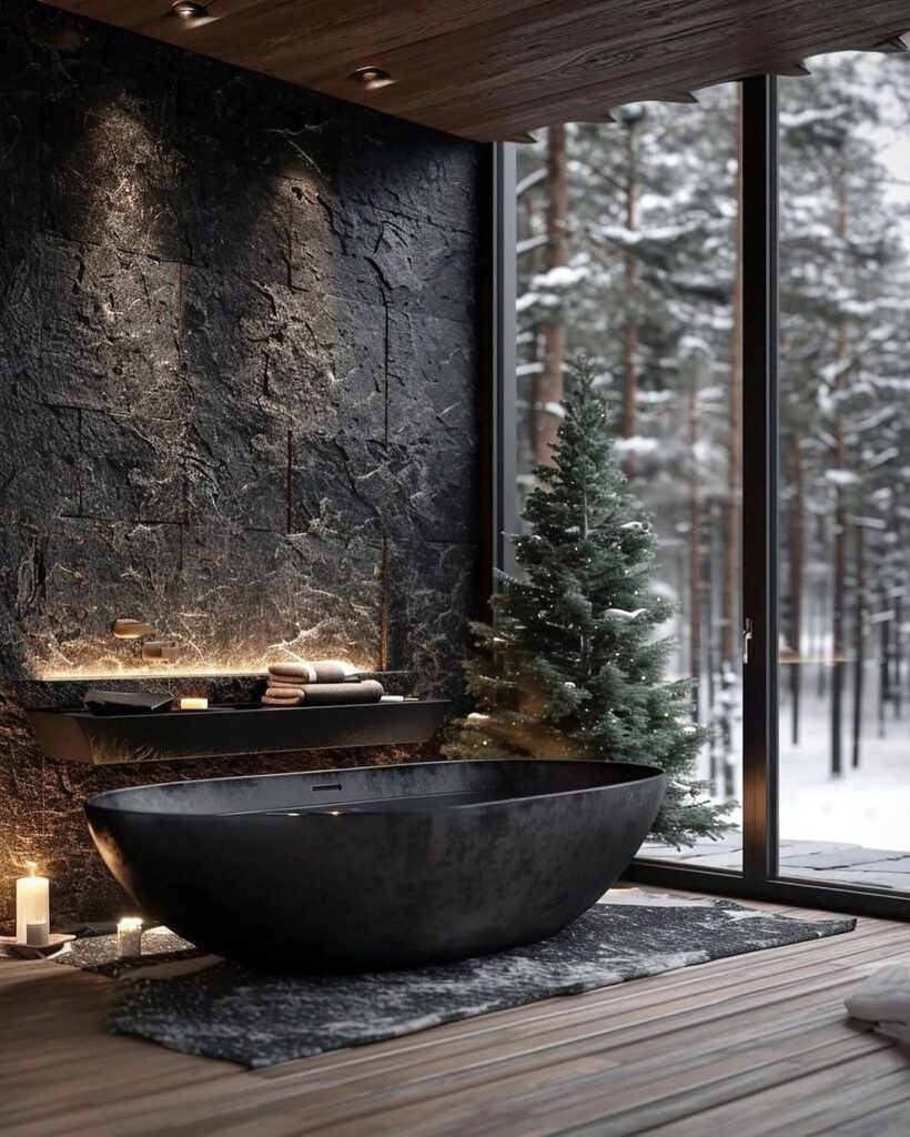 This second bathing area leans into dramatic intimacy. A deep freestanding tub rests against a rugged stone wall, gently lit by recessed lighting and candles. The large sliding glass doors dissolve the boundary between indoors and outdoors, letting winter light and forest views heighten the sense of retreat and solitude.