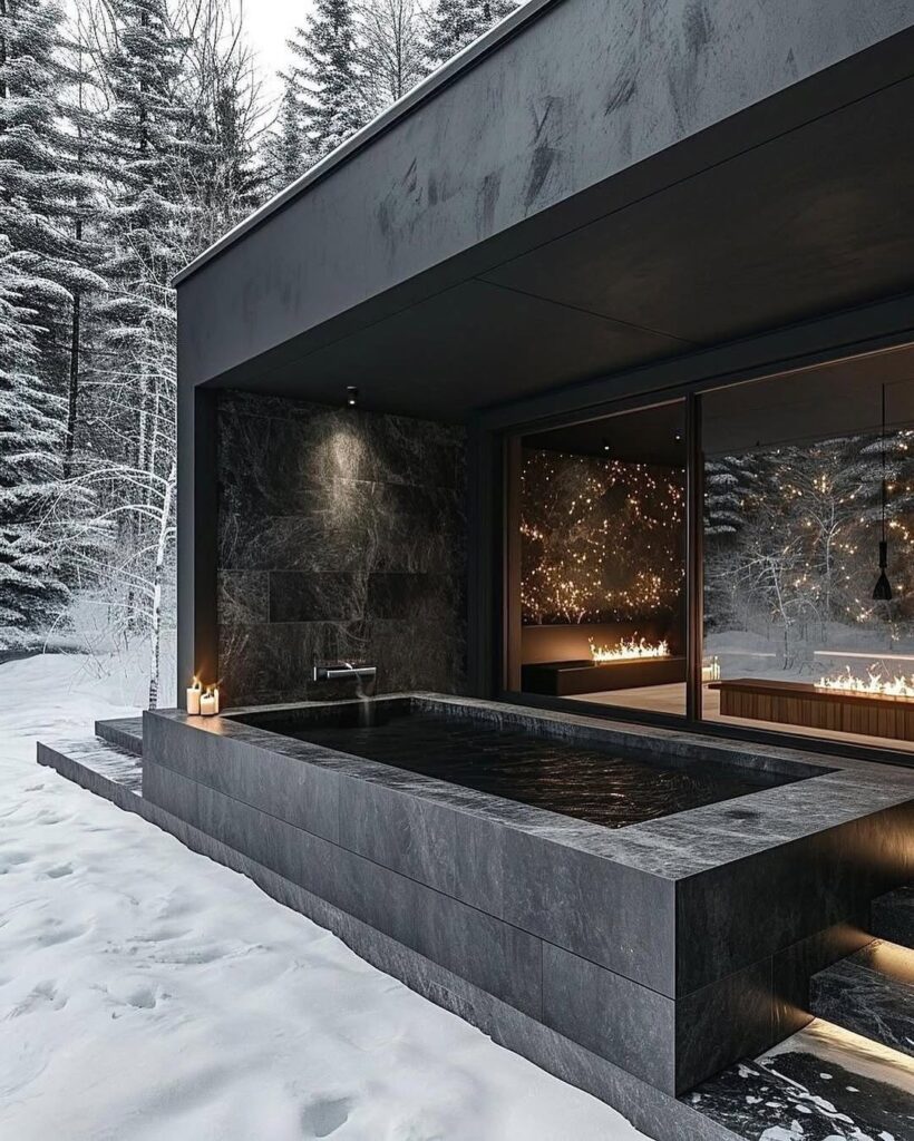 This outdoor spa terrace is carved directly into the winter landscape, where dark stone walls and a minimalist concrete roof frame a steaming plunge pool surrounded by snow. The contrast between the icy forest and the warm water creates a powerful sensory experience, amplified by soft candlelight and the subtle glow from the interior beyond the glass. It feels private, meditative, and deeply connected to nature.