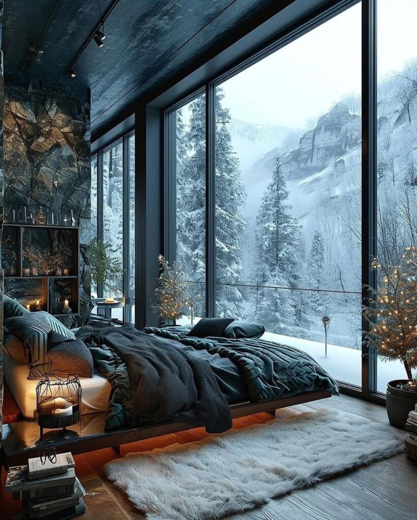 The bedroom is a serene cocoon suspended in the forest. Floor-to-ceiling windows frame a dramatic winter mountain backdrop, while soft lighting, plush bedding, and a thick fur rug add layers of comfort. The space feels quiet and protected, as if floating between shelter and wilderness.