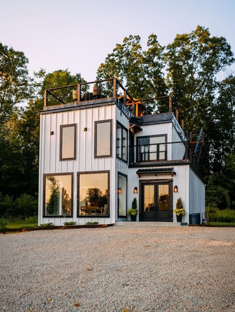 The exterior of the home reveals a striking modern form, defined by clean lines, vertical cladding, and expansive windows. The structure feels bold yet approachable, standing confidently within its natural surroundings.