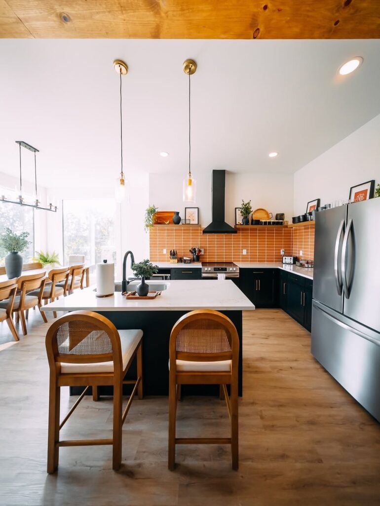 Natural light floods the kitchen through large windows, enhancing the contrast between the dark cabinetry and the light countertops. The terracotta-toned backsplash introduces warmth and character, creating a welcoming environment that feels both contemporary and timeless.