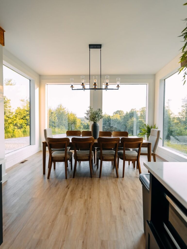 The dining area seamlessly extends from the kitchen, emphasizing openness and flow. Wooden chairs and a simple dining table reinforce the organic aesthetic, making the space ideal for shared meals and everyday moments.