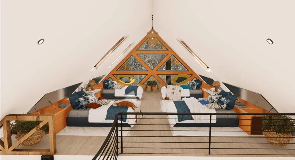 Additionally, there’s an attic bedroom accessible via a spiral staircase, providing ample sleeping space with its multiple beds.