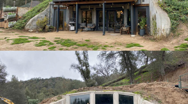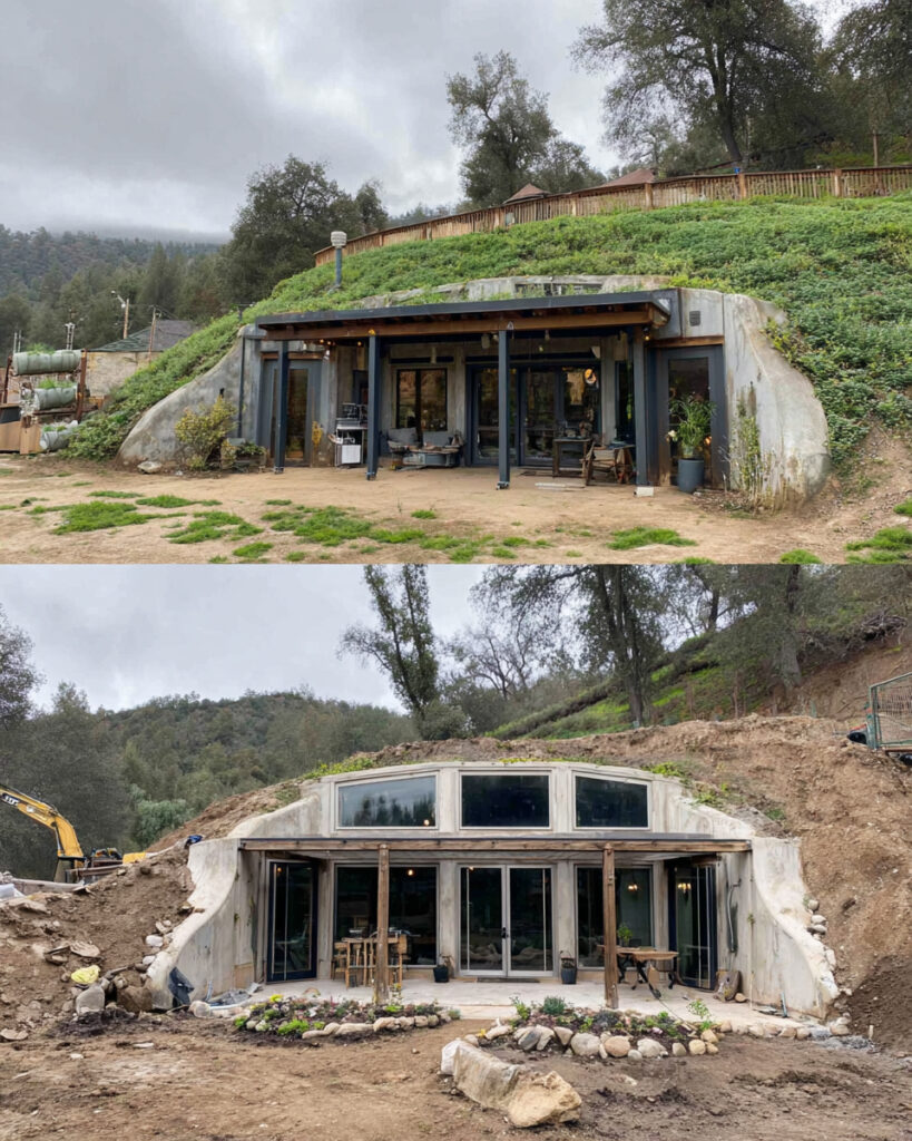Carved directly into a green hillside, this remarkable earth-sheltered home demonstrates how architecture can work in harmony with the natural landscape. From the outside, the structure appears almost invisible, with soil and vegetation covering the roof and surrounding walls. Large glass doors and a shaded front patio create a welcoming entrance while allowing natural light to reach deep into the interior.