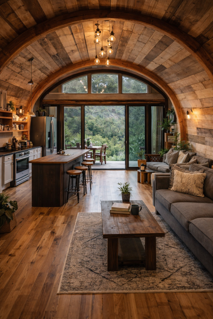 Inside, the home transforms into a warm and inviting sanctuary. Curved wooden beams and natural wood paneling create a soft, organic interior that contrasts beautifully with the rugged earth-covered exterior. The open-plan layout combines a cozy living area, kitchen, and dining space beneath a dramatic arched ceiling that enhances both the spaciousness and the character of the home.