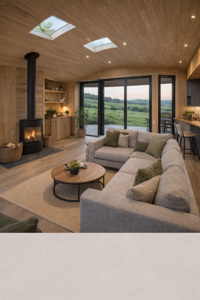 As the project evolves, the transformation becomes remarkable. The containers are carefully clad in warm natural timber, softening the once-industrial appearance and helping the home blend beautifully into the rural environment. Large floor-to-ceiling glass doors replace solid steel panels, opening the interior to sweeping panoramic views and allowing natural light to flood the living spaces.