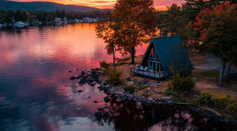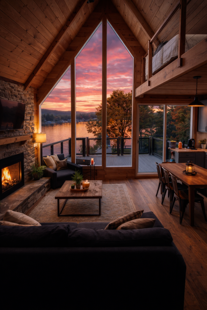 The living room welcomes you with a breathtaking wall of glass that frames the glowing sunset over the calm lake, blending the beauty of nature with the warmth of rustic design. Rich wooden textures wrap the space in comfort, while a stone fireplace softly crackles, creating a cozy and inviting atmosphere. The open layout flows effortlessly toward the outdoor deck, allowing the golden light of evening to pour inside. Every detail, from the plush seating to the warm lighting, is designed to make this space feel like a peaceful escape from the world.