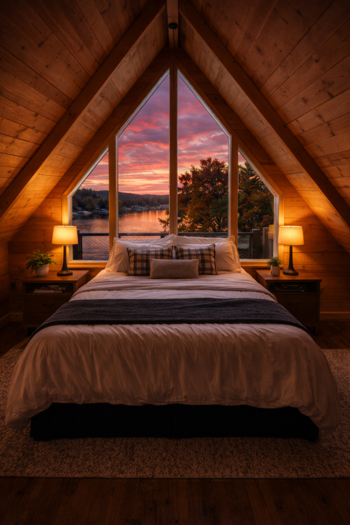 The bedroom is a peaceful haven tucked beneath the sloping wooden ceiling, where the triangular window perfectly frames the colorful sky and tranquil waters beyond. Soft bedding, warm lighting, and natural textures create a calming atmosphere that invites rest and relaxation. As the sun sets, the room fills with a gentle glow, making it the perfect place to unwind after a long day. This space feels intimate and serene, offering a quiet connection to the beauty outside.