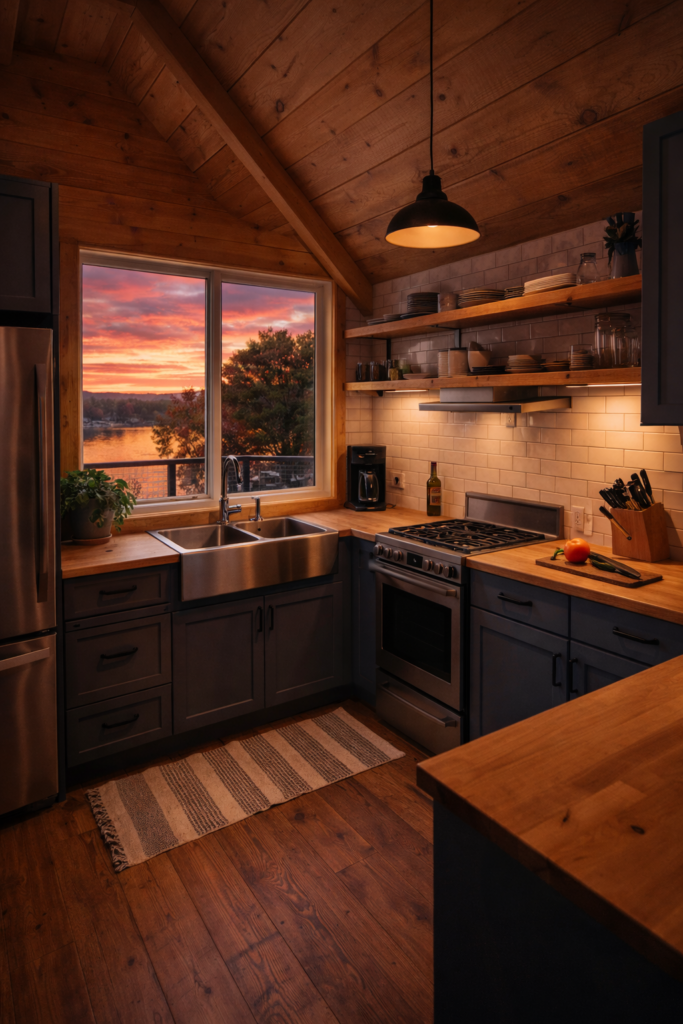 This charming kitchen captures the perfect balance between functionality and beauty, with natural wood finishes and modern appliances working in harmony. The large window above the sink offers a stunning view of the lake at sunset, turning everyday moments into something special. Soft under-cabinet lighting highlights the clean lines and thoughtful layout, while open shelves add a touch of simplicity and warmth. It’s a space where cooking feels relaxing, inspired by the surrounding nature and the gentle glow of evening light.