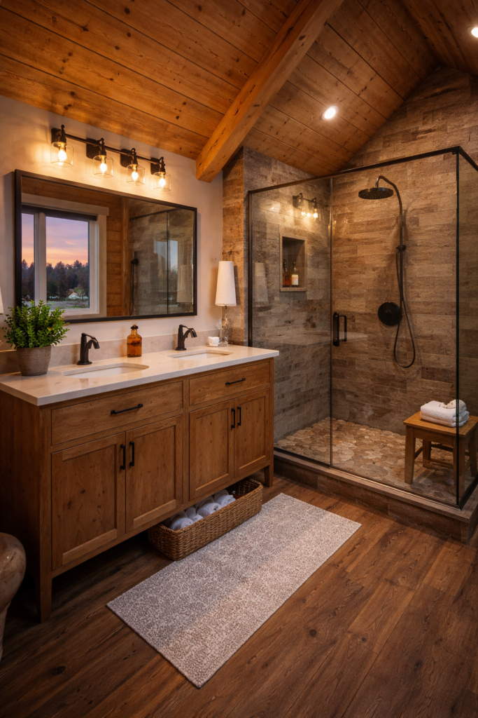The bathroom combines rustic charm with modern comfort, creating a spa-like retreat within the cabin. Natural wood tones and stone textures bring warmth and character, while the glass-enclosed shower adds a sleek, contemporary touch. Soft lighting enhances the relaxing ambiance, making it an ideal space to refresh and unwind. Every element is thoughtfully designed to provide comfort while maintaining the cozy, nature-inspired aesthetic of the home.