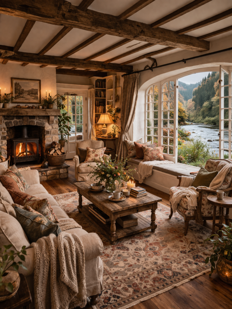 This charming riverside cottage is a true dream retreat, blending rustic beauty with comfort and peace. From the lovely exterior beside the flowing water to the warm living room, relaxing bathroom, and restful bedroom, every space feels thoughtfully designed to create calm and connection with nature. The wooden details, soft lighting, and breathtaking views of the river and autumn forest give the entire home a magical atmosphere. It is the kind of place that feels quiet, cozy, and unforgettable, offering the perfect escape from the noise of everyday life.