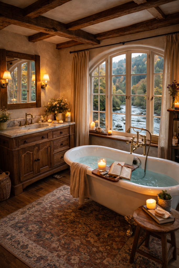 This bathroom feels like a private spa hidden in the countryside. The freestanding bathtub placed near the large window creates a relaxing focal point, while the warm wood vanity and soft candlelight add natural beauty and comfort. The view of the river and forest outside makes the room even more special, turning an everyday space into a peaceful retreat. It is the kind of bathroom that invites long, quiet moments of rest surrounded by warmth and nature.