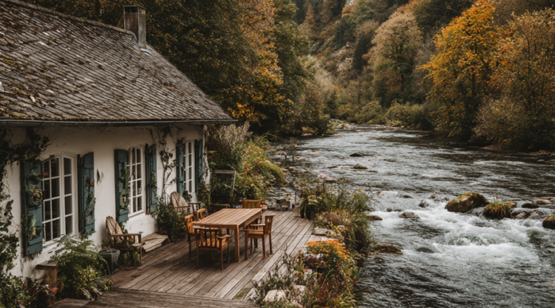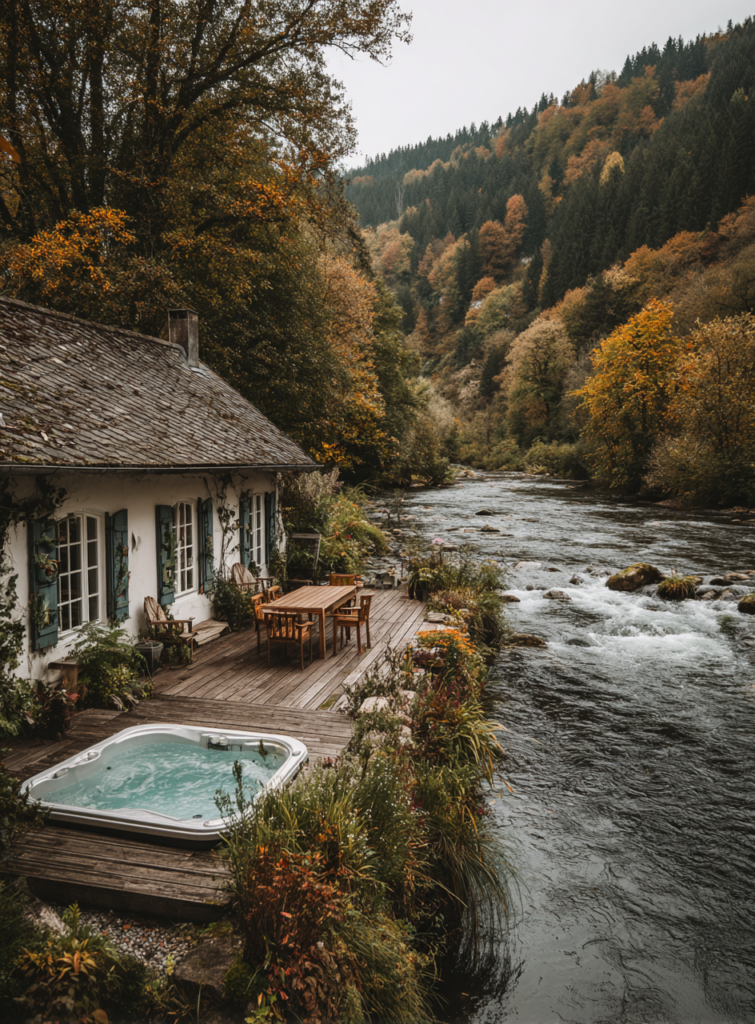 This beautiful cottage feels like a peaceful escape hidden in nature, resting quietly beside the flowing river and surrounded by rich autumn trees. The rustic white walls, weathered roof, and wooden deck create a timeless charm, while the outdoor hot tub adds a touch of comfort and luxury. With the sound of moving water and the beauty of the forest all around, this house looks like the perfect place to relax, breathe deeply, and enjoy a slower way of living.