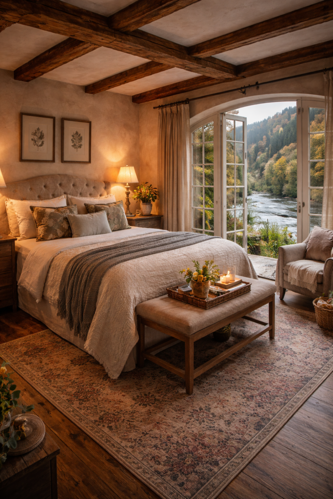 This bedroom is the perfect mix of comfort, simplicity, and rustic charm. The soft layered bedding, warm lamps, and wooden ceiling beams create a restful and cozy mood, while the open doors reveal a stunning river view that fills the room with natural beauty. The soft colors and elegant details make the space feel calm and welcoming, like a place designed for deep rest and peaceful mornings. It is a bedroom that feels both luxurious and deeply connected to the quiet landscape outside.